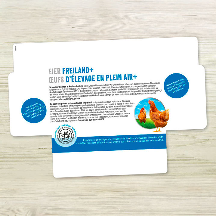 "We use Hartmann cartons for all four Naturafarm packaging sizes because of their exceptional quality, sustainability and a peel-off label. Its a really useful feature, because it can carry loads extra information on the reverse. And this gives us lots of free space to talk about animal welfare. So we can be totally transparent with the customer – nothing is hidden", says Karin Knecht-Bühler, Head of Sales and Logistics at Ei AG. "What’s more, the wide range of sizes and colours gives Coop a huge variety of options for creating product ranges."
