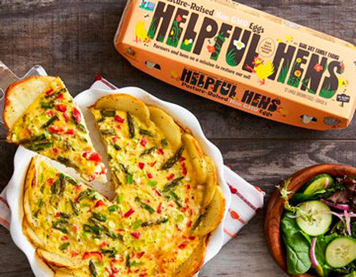 So unsurprisingly, Helpful Hens eggs are earth-friendly eggs, produced using 100% sustainable farming practices. Helpful Hens is on a mission to restore the soil and rejuvenate the Earth, building green ecosystems around their hens and working in harmony with nature to minimize their carbon footprint. The first regeneratively-farmed, premium eggs to hit the market, the Helpful Hens brand promotes soil health, carbon sequestration and diverse pastures, as their hens lead the efforts to aerate, graze, and fertilize the land.