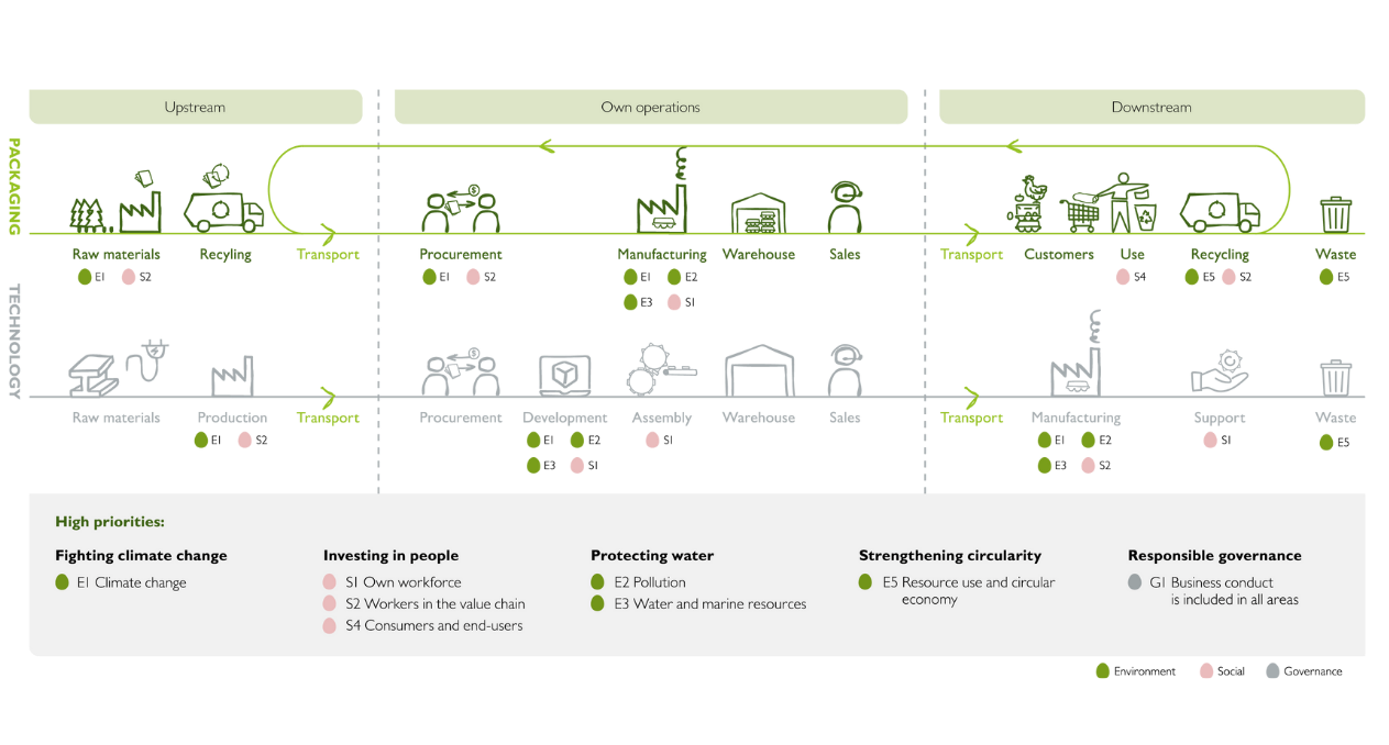 For Hartmann Technology, our activities span development, procurement, assembly, testing, and installation of machinery. We source steel, machinery parts, and electronics from upstream suppliers, and Hartmann’s own packaging business is among our biggest customers. Downstream, we deliver and install machinery, provide ongoing support, and ensure that equipment at end-of-life can be recycled—primarily as steel, which is fully recyclable.
