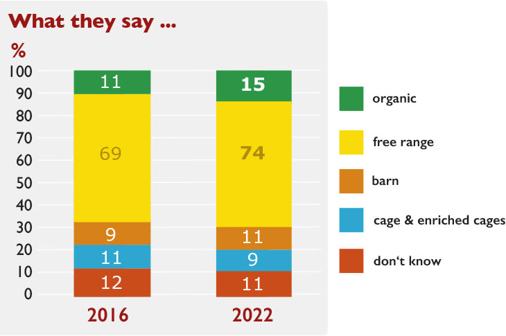 Organic eggs are currently more popular than they were in 2016 – and are now the second most likely type of eggs to be bought after free range. Organic products are seen on the one hand to be positive for the environment, but on the other, they’re considered overpriced. This negative attitude is a likely inhibitor of growth in the UK, although (since 1 in 5 don’t understand the difference between organic and other products), a programme of education may help improve attitudes. Overall, future inclination towards purchasing organic products is largely positive or neutral.