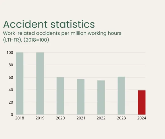 We promote the conditions outlined in the UN Global Compact’s human and labour rights principles in our value chain across all locations. The health and safety of our workers are of utmost importance to us, which is reflected in our declining injury rate.