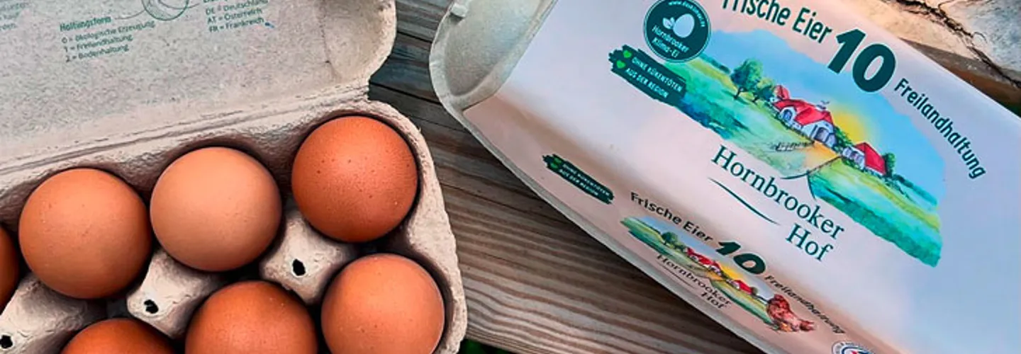 Hornbrooker Hof is a traditional family business founded more than 70 years ago by the Goldnick family and now run by the 3rd and 4th generation. Their focus has always been on species-appropriate animal husbandry, freshness and well-thought-out logistics. Besides their own egg production, Hornbrooker Hof works with partners who deliver the eggs to the farm to be packed there and sold under the same label.
