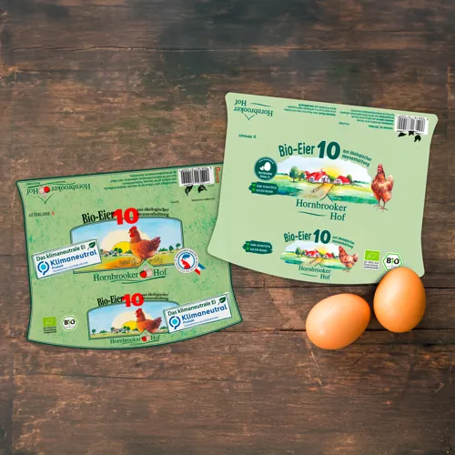 By staying true to Hornbrooker Hof’s core values while embracing modern design trends, we were able to create a brand identity that feels both authentic and fresh. Each label now feels like an extension of the farm itself – rooted in nature but forward-looking in its presentation. The eggs are packed in our 2x6 and 1x10 imagic2® and are sold in more than 160 large and small stores throughout northern Germany.