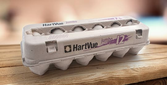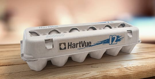 HartVue is a traditional gray molded fiber egg carton made from recycled paper. The print on the top and front of the lid with up to four colors clearly conveys the product statement.